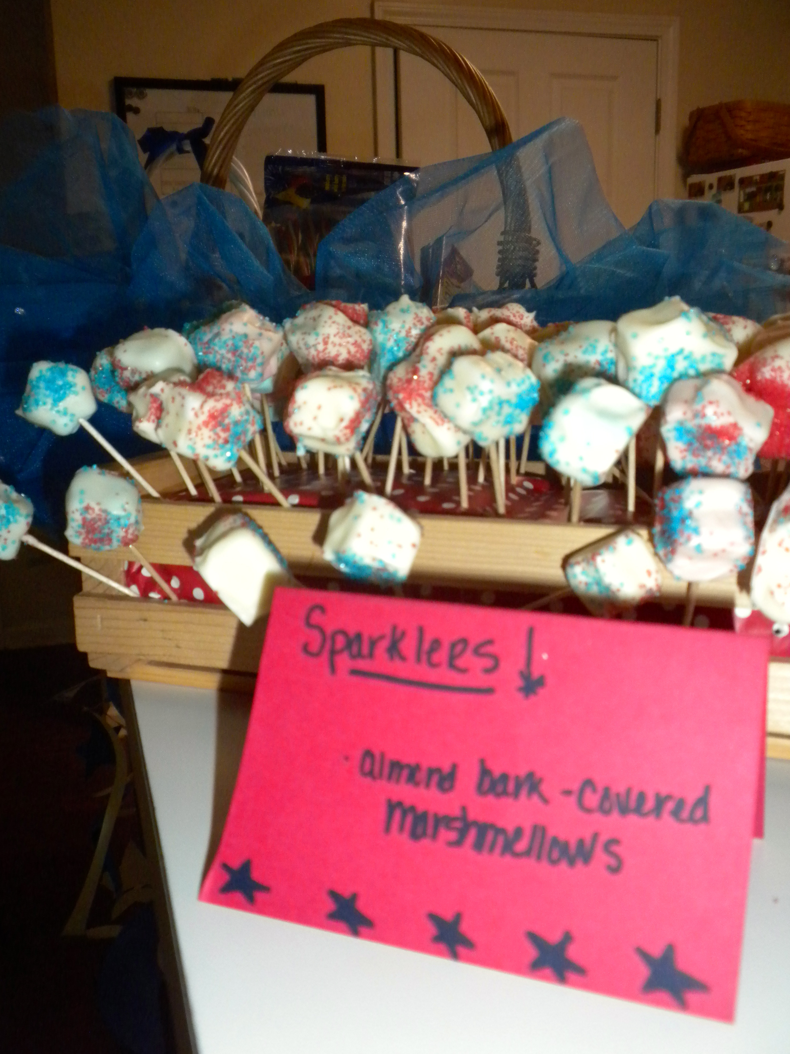 I had this little crate and some foam, so I wrapped the foam in some red wrapping paper and made a cute little display for my marshmallow treats. Notice the basket in the background? I had a blue tutu that fit perfectly around it to hold all the *real* sparklers! Adding little themed titles to all the food added fun to the whole display. It’s seriously just some dipped marshmallows.