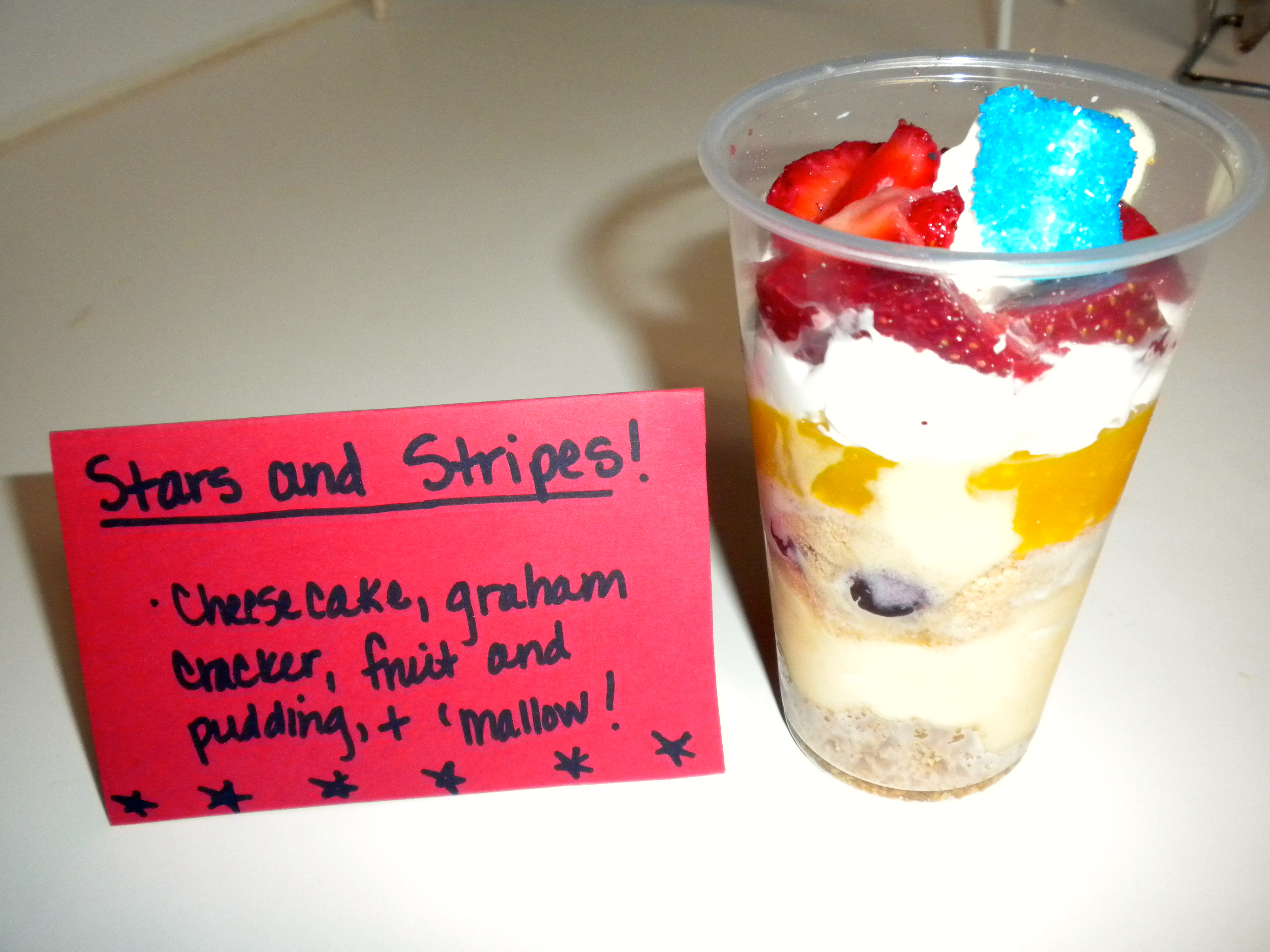 I love cheesecake. I really wanted cheesecake. I found this recipe on pinterest, but modified it a little bit. Time was a big factor for me. Here’s what I used for the layers: Jello no bake cheesecake dessert, graham cracker crumbs, blueberries, graham cracker crumbs, vanilla pudding, whipped cream, strawberries, sugar/chocolate dipped ‘mallow.