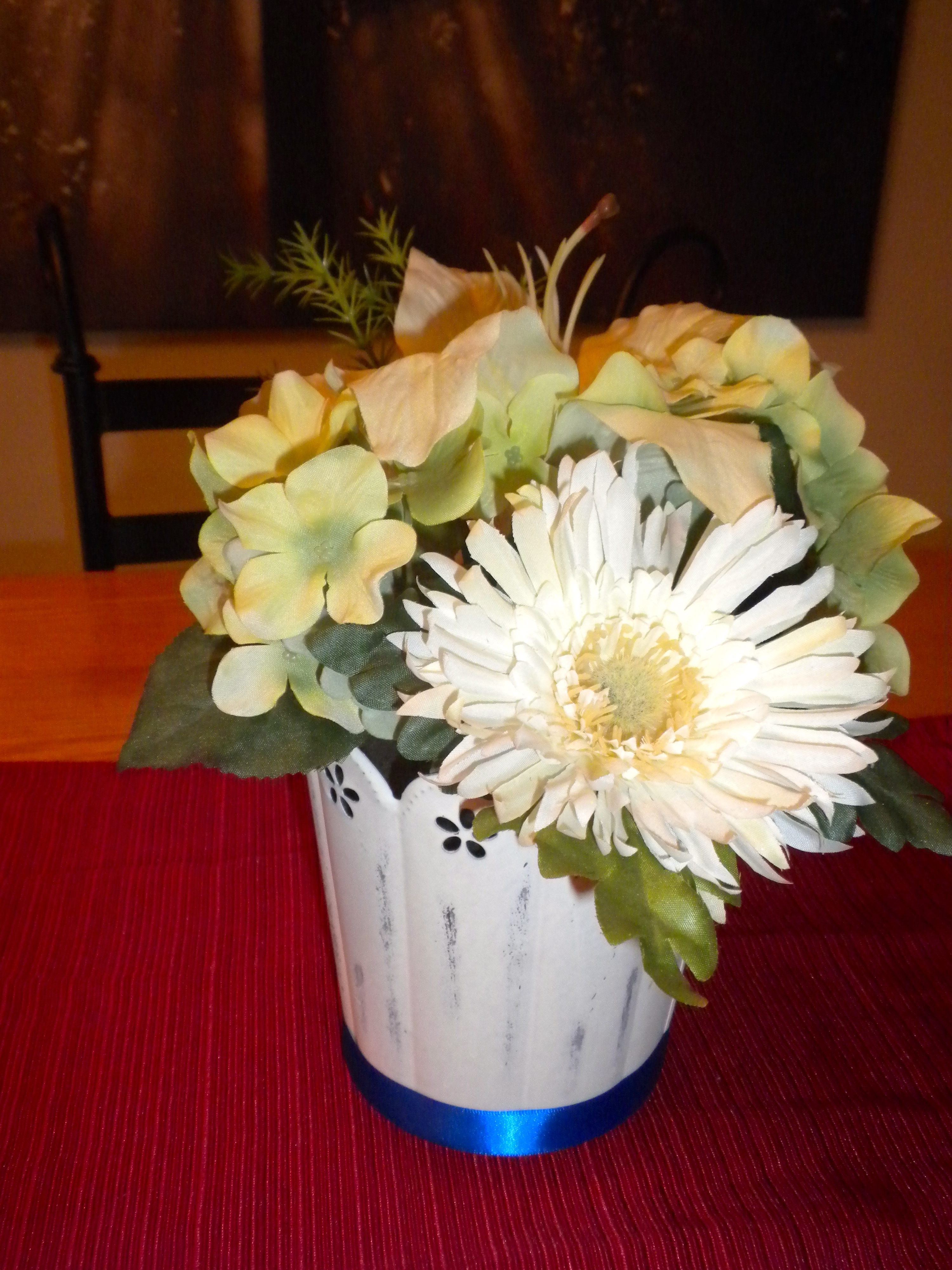 A white flower arrangement is handy to have because you can add it into any themed party. Add a ribbon and you’re good to go! I’ve used this for several parties, with different accents.